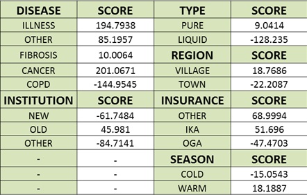X Score =500 + TYPE=PURE (9.0414) + REGION=VILLAGE (18.7686) + INSURANCE=IKA (51.696) + SEASON=COLD (-15.0543) + DISEASE=CANCER (201.0671) + INSTITUTION=OLD (45.981) .