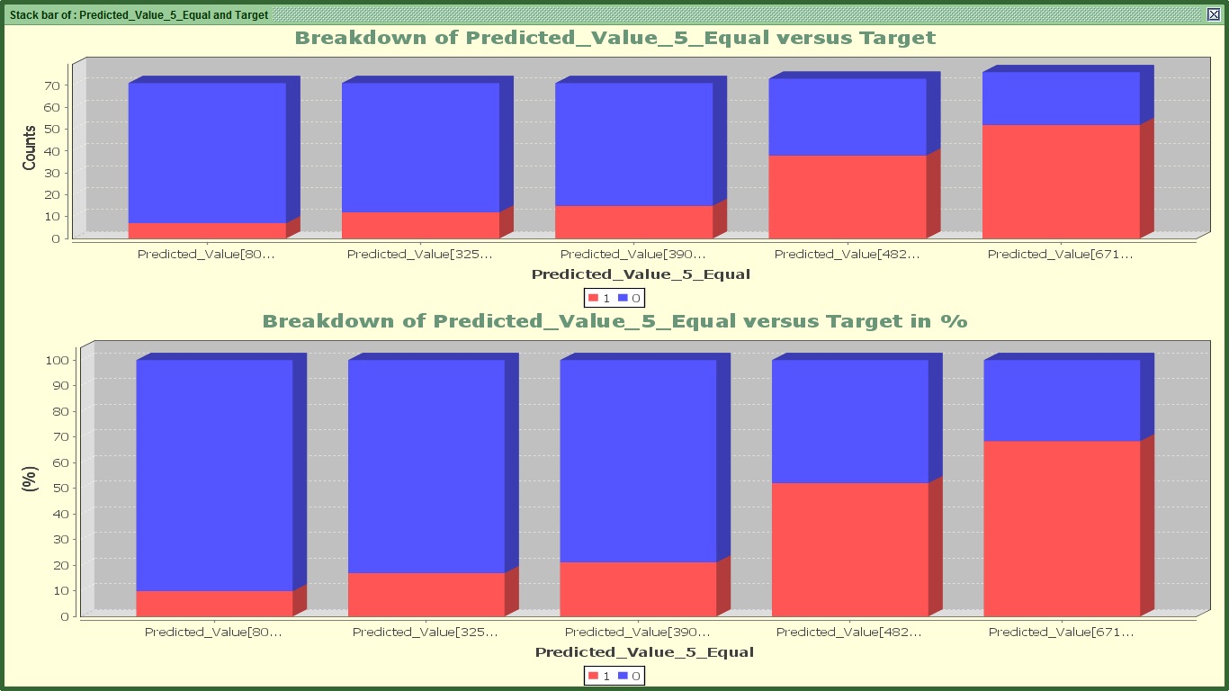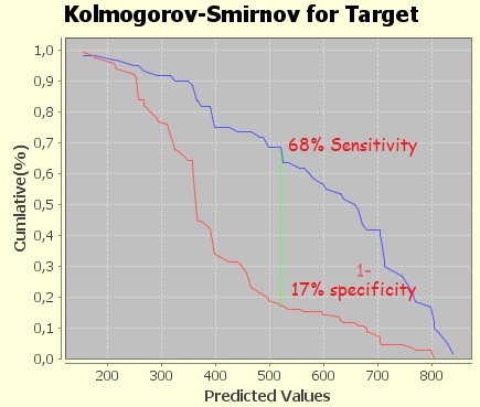 The second graph shows the Kolmogorov-Smirnov curve. Imagine that we sort all the subscribers that were in the validation set from the smallest (left) to the largest (right) based on the predicted score. The blue line (forget what the labels say under the graph, they do funny things sometimes), shows the proportion of the total churners (those that have a value of 1) that have a score higher than the displayed one. This percentage is also called Sensitivity. Similarly the red line shows the proportion of the total non-churners (those that have a value of 0) that have a score higher than the displayed one. This percentage is also called one minus Specificity. In my case, where the green line is, at the score of 522 approximately, is the maximum distance between the two proportions (e.g. the biggest value after subtracting them).