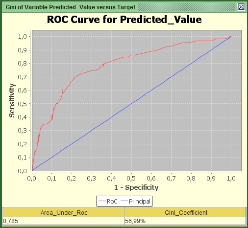 Let’s move our focus to the middle panel. The first graph that you see is the RoC or Gini curve same as we have viewed before for the variables individually. The only difference is that this one takes into account all the variables and it is for the validation set only. In my case the curve has some strange sharp ups and downs because the validation population is relatively small and nonlinearities exist in the score in comparison to how the target moves (e.g. is not always the higher the score…the higher the propensity to churn in a linear relationship).
