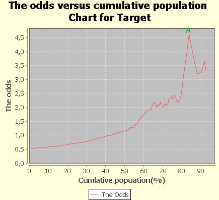 See the point A in my chart. This tells me that if I accept approximately 85% of the population with the lowest score and reject only the 15% with the highest score, the ones that would have truly churned are 4.5 times more than those who would have not churned.