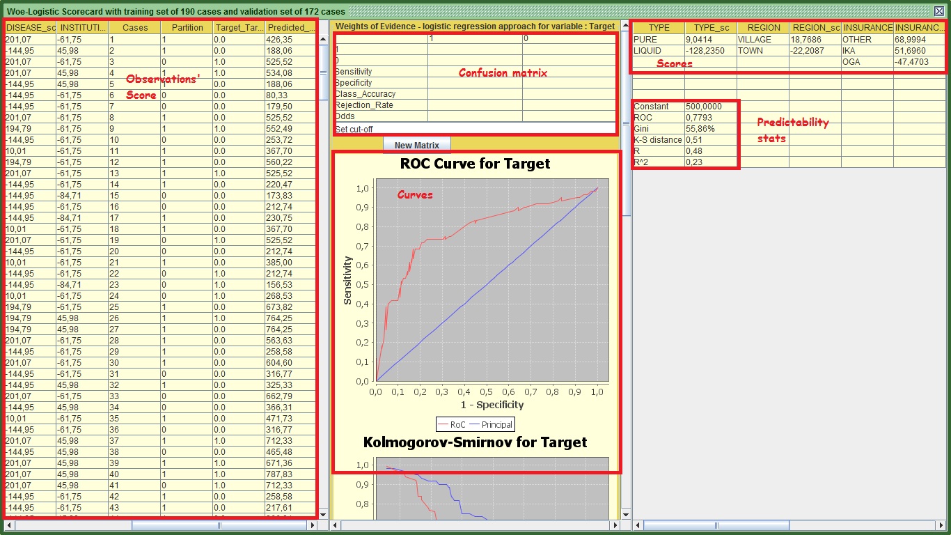 Let’s start from the right panel. This panel contains the actual scorecard and the predictability statistics that show how good the model is in regards to the validation set only. You can export that by selecting all the table holding down the left click of your mouse and pressing ctrl + c . Then go to an excel spreadsheet or notepad or anything that accepts letters and press ctrl + v or just paste. You will definitely get different scores as we have different partitions. The predicted score for each observation is computed as follows: